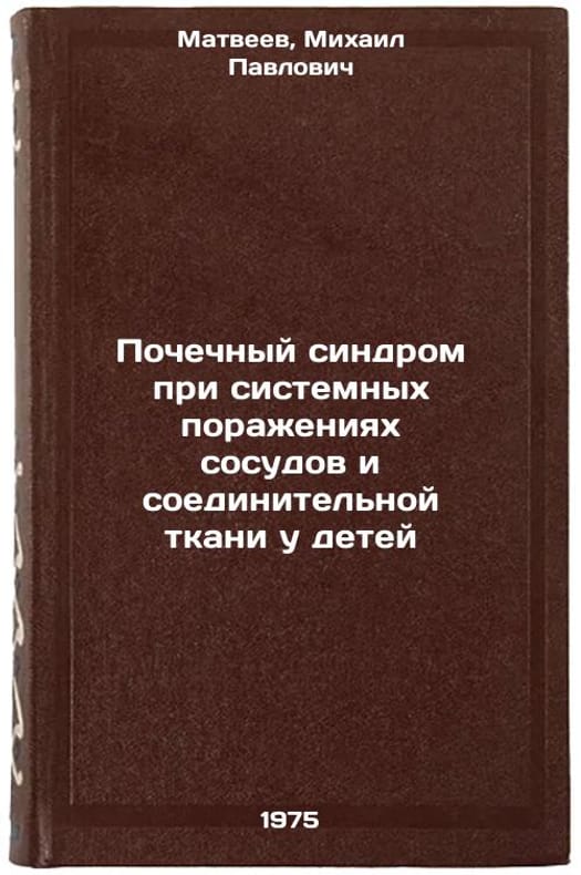 In Russian. Matveev, Mikhail Pavlovich. Kidney syndrome in systemic lesions of blood vessels and connective tissue in children. Moscow: 1975-. Pochechnyy sindrom pri sistemnykh porazheniyakh sosudov i soedinitel'noy tkani u detey. In Russian /Kidney syndrome in systemic damage to blood vessels and connective tissue in children. All images are for identification of editions only. Several books of the same edition may be available. Please feel free to request photos of available books. SKU6781310
