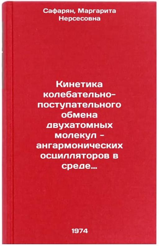In Russian. Safaryan, Margarita Nersesovna. The kinetics of the oscillating-progressive exchange of two-atomic molecules - anharmonic oscillators in an inert gas environment. Moscow: 1974-. Kinetika kolebatel'no-postupatel'nogo obmena dvukhatomnykh molekul - angarmonicheskikh ostsillyatorov v srede inertnogo gaza. In Russian /The kinetics of the oscillating-progressive exchange of bi-atomic molecules - anharmonic oscillators in an inert gas environment. All images are for identification of editions only. Several books of the same edition may be available. Please feel free to request photos of available books. SKU6800415