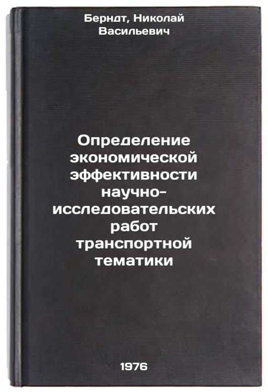 In Russian. Berndt, Nikolai Vasilievich. Determination of the Economic Efficiency of Research Activities in Transport Issues. Leningrad: 1976-. Opredelenie ekonomicheskoy effektivnosti nauchno-issledovatel'skikh rabot transportnoy tematiki. In Russian /Measuring the Economic Efficiency of Transport Research . All images are for identification of editions only. Several books of the same edition may be available. Please feel free to request photos of available books. SKU6802321