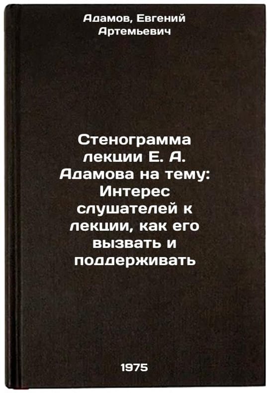 In Russian. Adamov, Evgeniy Artemyevich. Transcript of a lecture by E. A. Adamov on the topic: Listeners' interest in the lecture, how to summon and maintain it. Moscow: 1975. Stenogramma lektsii E. A. Adamova na temu: Interes slushateley k lektsii, kak ego vyzvat' i podderzhivat'. In Russian /Transcript of the lecture by E. A. Adamov on the topic: Listeners' interest in the lecture, how to summon it and support it. All images are for identification of editions only. Several books of the same edition may be available. Please feel free to request photos of available books. SKU6904267