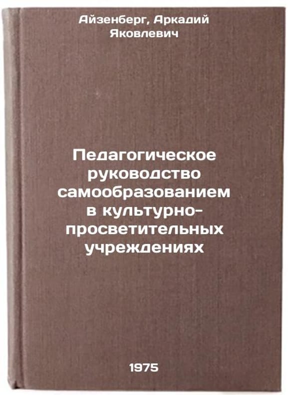 In Russian. Eisenberg, Arkady Yakovlevich. The pedagogical management of self-education in cultural and educational institutions. Moscow: IPCC, 1975. Pedagogicheskoe rukovodstvo samoobrazovaniem v kul'turno-prosvetitel'nykh uchrezhdeniyakh. In Russian /Educational management of self-education in cultural and educational institutions. All images are for identification of editions only. Several books of the same edition may be available. Please feel free to request photos of available books. SKU6904491