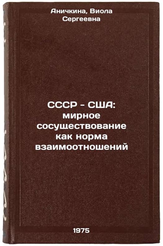 In Russian. Anichkina, Viola Sergeevna. USSR-US: Peaceful Coexistence as a Norm of Relations. Moscow: Knowledge, 1975. SSSR - SShA: mirnoe sosushchestvovanie kak norma vzaimootnosheniy. In Russian /USSR-US: Peaceful Coexistence as a Normal Relationship. All images are for identification of editions only. Several books of the same edition may be available. Please feel free to request photos of available books. SKU6906118