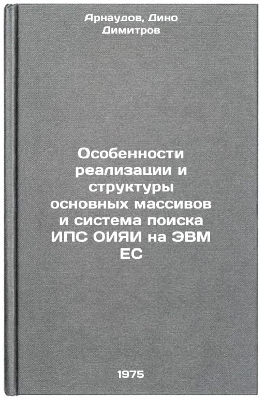 In Russian. Arnaudov, Dino Dimitrov. Peculiarities of the implementation and structure of the main arrays and the JINR ICS search system on the ES computer. Dubna: JINR, 1975. Osobennosti realizatsii i struktury osnovnykh massivov i sistema poiska IPS OIYaI na EVM ES. In Russian /Peculiarities of the implementation and structure of the main arrays and the JINR ICS search system on the EU computer. All images are for identification of editions only. Several books of the same edition may be available. Please feel free to request photos of available books. SKU6906652