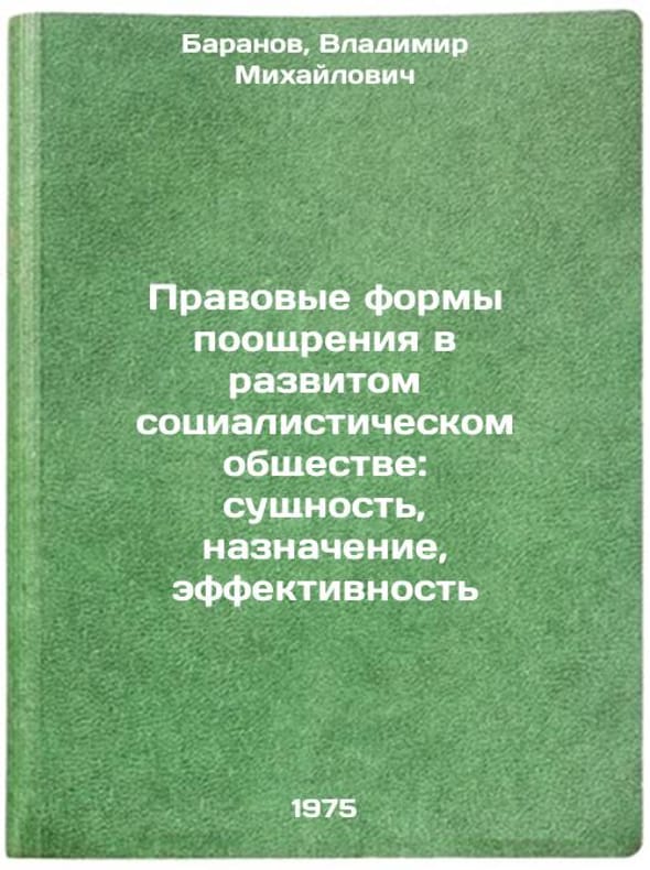 In Russian. Baranov, Vladimir Mikhailovich. Legal Forms of Promotion in a Developed Socialist Society: Nature, Purpose, Efficiency. Saratov: Publishing House of Saratov, 1975. Pravovye formy pooshchreniya v razvitom sotsialisticheskom obshchestve: sushchnost', naznachenie, effektivnost'. In Russian /Legal forms of encouragement in a developed socialist society: essence, purpose, effectiveness. All images are for identification of editions only. Several books of the same edition may be available. Please feel free to request photos of available books. SKU6908226
