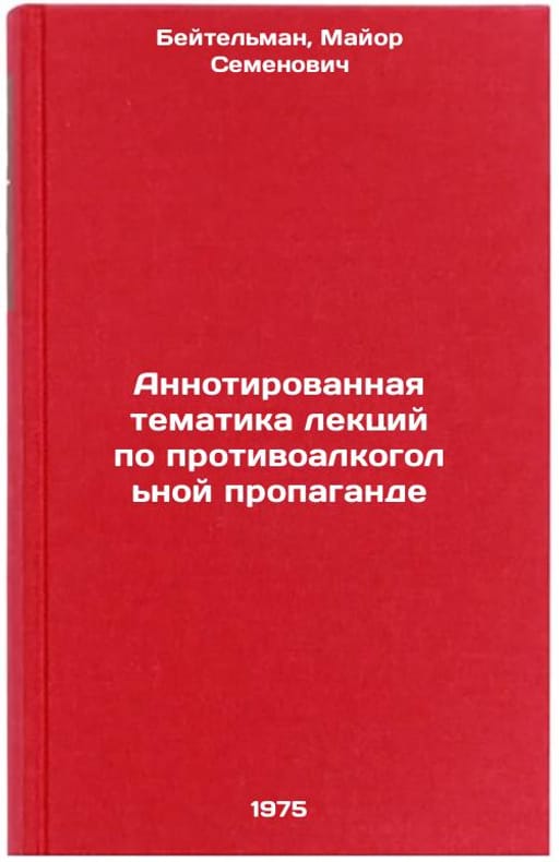 In Russian. Beitelman, Major Semenovich. Annotated Topics of Lectures on Anti-Alcohol Propaganda. Moscow: Knowledge, 1975. Annotirovannaya tematika lektsiy po protivoalkogol'noy propagande. In Russian /Annotated Topics of Lectures on Anti-Alcohol Propaganda. All images are for identification of editions only. Several books of the same edition may be available. Please feel free to request photos of available books. SKU6908971