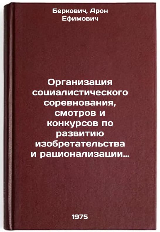 In Russian. Berkovich, Aron Efimovich. Organization of socialist competition, reviews and competitions for the development of invention and rationalization in industrial enterprises. Kyiv: Znanie of the Ukrainian SSR, 1975. Organizatsiya sotsialisticheskogo sorevnovaniya, smotrov i konkursov po razvitiyu izobretatel'stva i ratsionalizatsii na promyshlennykh predpriyatiyakh. In Russian /Organization of socialist competitions, reviews and competitions for the development of invention and rationalization in industrial enterprises. All images are for identification of editions only. Several books of the same edition may be available. Please feel free to request photos of available books. SKU6909690
