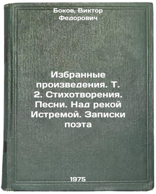 In Russian. Bokov, Viktor Fedorovich. Selected Works. Vol. 2. Poems. Songs. Over the Istrema River. Poet's Notes. Moscow: Artist's Lit., 1975. Izbrannye proizvedeniya. T. 2. Stikhotvoreniya. Pesni. Nad rekoy Istremoy. Zapiski poeta. In Russian /Selected Works. Vol. 2. Poems. Songs. Over the River Istrema. Poet's Notes. All images are for identification of editions only. Several books of the same edition may be available. Please feel free to request photos of available books. SKU6910748