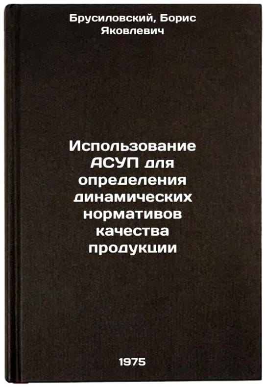 In Russian. Brusilovsky, Boris Yakovlevich. The use of ACS to determine dynamic norms of product quality. Kyiv: Znanie of the Ukrainian SSR, 1975. Ispol'zovanie ASUP dlya opredeleniya dinamicheskikh normativov kachestva produktsii. In Russian /Use of ACMS to determine dynamic product quality standards. All images are for identification of editions only. Several books of the same edition may be available. Please feel free to request photos of available books. SKU6911668