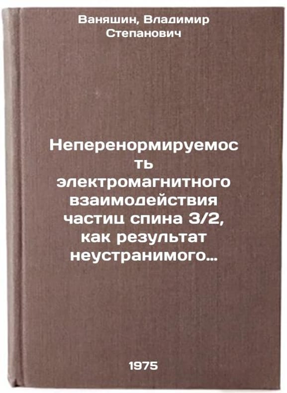 In Russian. Vanyashin, Vladimir Stepanovich. The irregularity of the electromagnetic interaction of spin particles 3 / 2 as a result of the irrecoverable energy growth of Bourne amplitudes. Kiev: 1975. Neperenormiruemost' elektromagnitnogo vzaimodeystviya chastits spina 3-2, kak rezul'tat neustranimogo energeticheskogo rosta bornovskikh amplitud. In Russian /Unperturbability of electromagnetic interaction of spin particles 3-2, as a result of the irrecoverable energy growth of Bourne amplitudes. All images are for identification of editions only. Several books of the same edition may be available. Please feel free to request photos of available books. SKU6912937