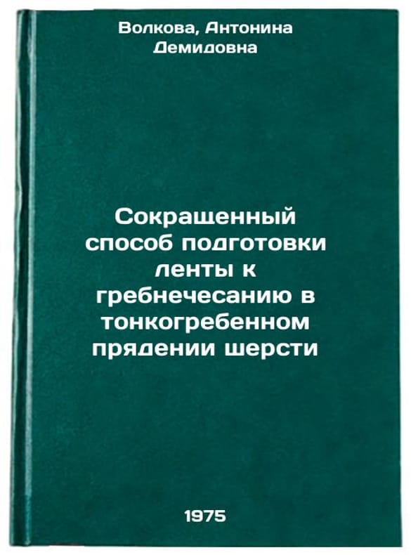 In Russian. Volkova, Antonina Demidovna. Reduced method of preparing the tape for comb comb in fine wool spinning. Moscow: 1975. Sokrashchennyy sposob podgotovki lenty k grebnechesaniyu v tonkogrebennom pryadenii shersti. In Russian /Reduced method of preparing the tape for comb comb in fine wool spinning. All images are for identification of editions only. Several books of the same edition may be available. Please feel free to request photos of available books. SKU6914818