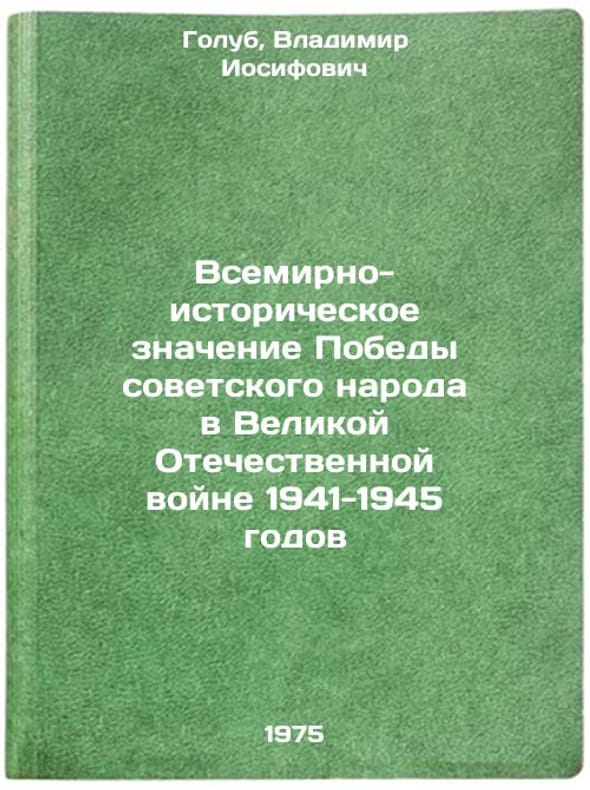 In Russian. Golub, Vladimir Iosifovich. The World Historical Significance of the Victory of the Soviet People in the Great Patriotic War of 1941-1945. Kyiv: 1975. Vsemirno-istoricheskoe znachenie Pobedy sovetskogo naroda v Velikoy Otechestvennoy voyne 1941-1945 godov. In Russian /The World Historical Significance of the Victory of the Soviet People in the Great Patriotic War of 1941-1945. All images are for identification of editions only. Several books of the same edition may be available. Please feel free to request photos of available books. SKU6920978