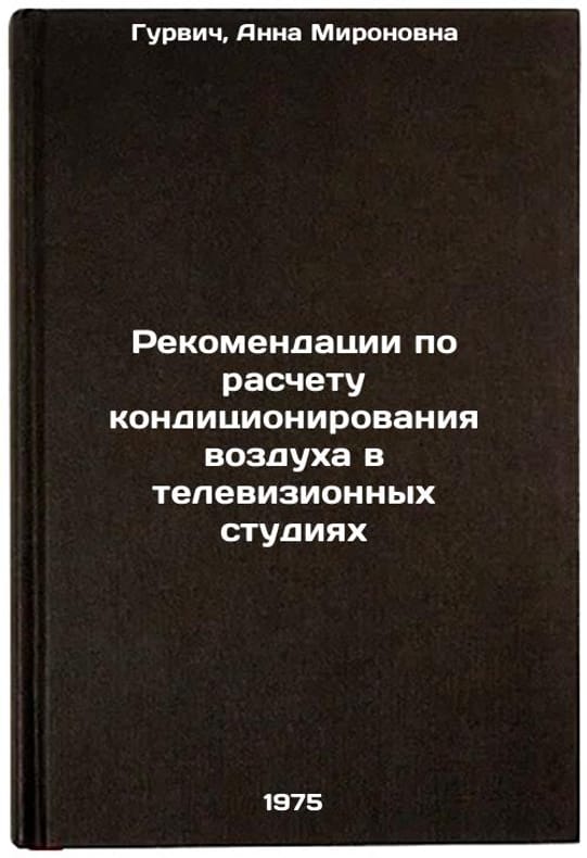 In Russian. Gurvich, Anna Mironovna. Guidelines for calculating air conditioning in television studios. Riga: Riga Polytechnic Institute, 1975. Rekomendatsii po raschetu konditsionirovaniya vozdukha v televizionnykh studiyakh. In Russian /Guidelines for calculating air conditioning in television studios. All images are for identification of editions only. Several books of the same edition may be available. Please feel free to request photos of available books. SKU6924170