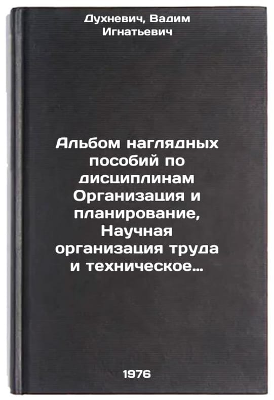 In Russian. Dukhnevich, Vadim Ignatievich. An album of visual aids on the disciplines Organization and Planning, Scientific Organization of Labor and Technical Normalization, and Industrial Production Management. Cheboksary: 1976. Al'bom naglyadnykh posobiy po distsiplinam Organizatsiya i planirovanie, Nauchnaya organizatsiya truda i tekhnicheskoe normirovanie i Upravlenie promyshlennym proizvodstvom. In Russian /An album of visual aids on the disciplines Organization and Planning, Scientific Organization of Work and Technical Rationing, and Industrial Management . All images are for identification of editions only. Several books of the same edition may be available. Please feel free to request photos of available books. SKU6932118