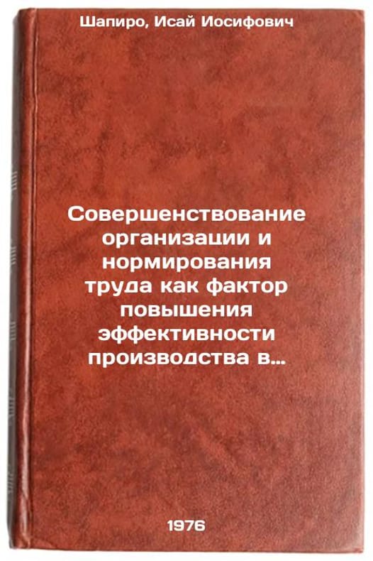 In Russian. Shapiro, Isai Iosifovich. Improvement of labor organization and standardization as a factor in increasing production efficiency in the machine-building industry. Moscow: 1976. Sovershenstvovanie organizatsii i normirovaniya truda kak faktor povysheniya effektivnosti proizvodstva v mashinostroitel'noy promyshlennosti. In Russian /Improvement of labor organization and standardization as a factor in increasing production efficiency in the mechanical engineering industry . All images are for identification of editions only. Several books of the same edition may be available. Please feel free to request photos of available books. SKU6935627