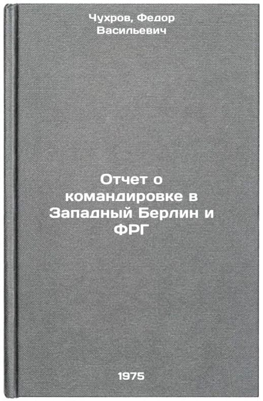 In Russian. Chukhrov, Fedor Vasilievich. Report on his mission to West Berlin and Germany. Moscow: 1975. Otchet o komandirovke v Zapadnyy Berlin i FRG. In Russian /Report on his mission to West Berlin and Germany. All images are for identification of editions only. Several books of the same edition may be available. Please feel free to request photos of available books. SKU6937366