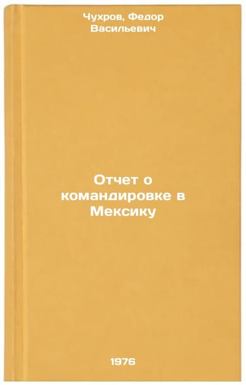 In Russian. Chukhrov, Fedor Vasilievich. Report on a mission to Mexico. Moscow: 1976. All images are for identification of editions only. Several books of the same edition may be available. Please feel free to request photos of available books. SKU6937367