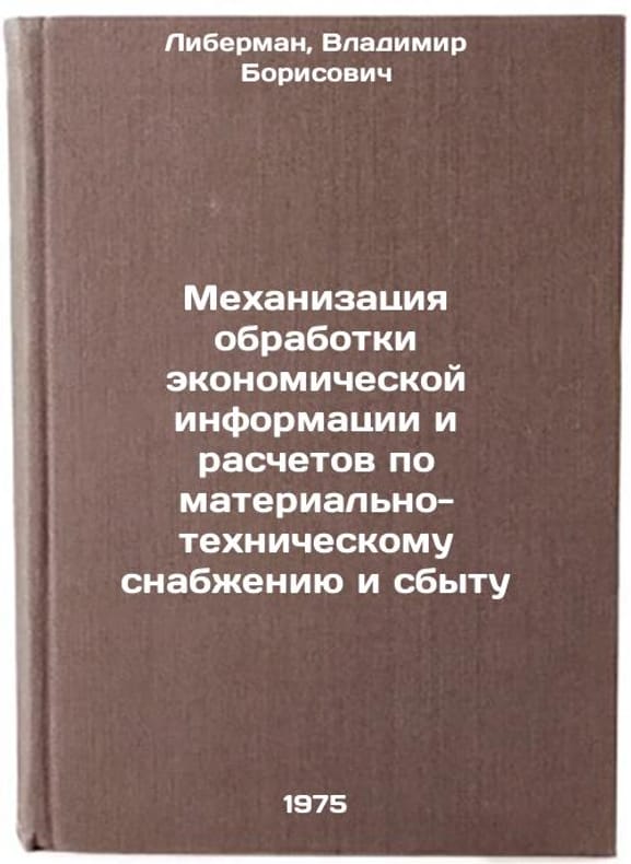 In Russian. Liberman, Vladimir Borisovich. Mechanization of Economic Information Processing and Payments for Material Supply and Sales. Moscow: Economics, 1975. Mekhanizatsiya obrabotki ekonomicheskoy informatsii i raschetov po material'no-tekhnicheskomu snabzheniyu i sbytu. In Russian /Mechanization of Economic Information Processing and Purchasing and Distribution. All images are for identification of editions only. Several books of the same edition may be available. Please feel free to request photos of available books. SKU6939580