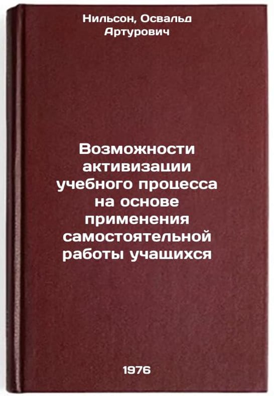 In Russian. Nilson, Oswald Arturovich. Possibilities of Intensifying the Educational Process through the Application of Independent Student Work. Moscow: 1976. Vozmozhnosti aktivizatsii uchebnogo protsessa na osnove primeneniya samostoyatel'noy raboty uchashchikhsya. In Russian /Opportunities for strengthening the learning process through the use of self-help by students . All images are for identification of editions only. Several books of the same edition may be available. Please feel free to request photos of available books. SKU6947600
