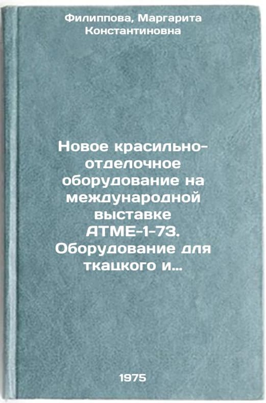 In Russian. Filippova, Margarita Konstantinovna. New painting and finishing equipment at the international exhibition ATME-1-73. Equipment for weaving and painting and finishing. Moscow: Central Scientific and Research Institute of Information and Technological and Economic Research, 1975. Novoe krasil'no-otdelochnoe oborudovanie na mezhdunarodnoy vystavke ATME-1-73. Oborudovanie dlya tkatskogo i krasil'no-otdelochnogo proizvodstva. In Russian /New painting and finishing equipment at the international exhibition ATME-1-73. Equipment for weaving and painting and finishing. All images are for identification of editions only. Several books of the same edition may be available. Please feel free to request photos of available books. SKU6953110