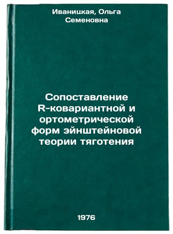 In Russian. Ivanitskaya, Olga Semenovna. Comparison of R-covariant and orthometric forms of Einstein's theory of gravity. Minsk: 1976. Sopostavlenie R-kovariantnoy i ortometricheskoy form eynshteynovoy teorii tyagoteniya. In Russian /Comparison of R-covariant and orthometric forms of Einstein's theory of gravity . All images are for identification of editions only. Several books of the same edition may be available. Please feel free to request photos of available books. SKU6958025