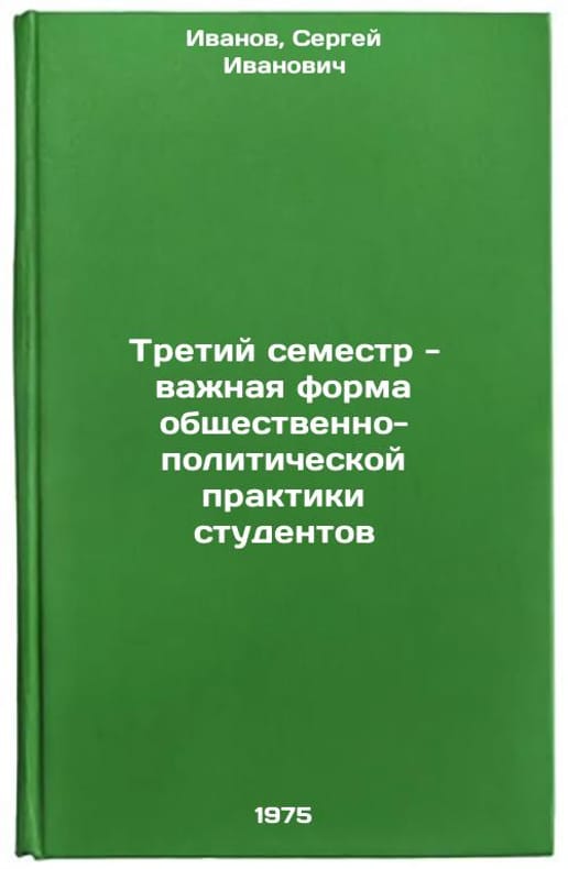 In Russian. Ivanov, Sergey Ivanovich. The third semester is an important form of social and political practice for students. Minsk: High School, 1975. Tretiy semestr - vazhnaya forma obshchestvenno-politicheskoy praktiki studentov. In Russian /Third semester - an important form of social and political practice for students. All images are for identification of editions only. Several books of the same edition may be available. Please feel free to request photos of available books. SKU6958245