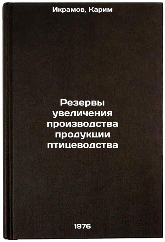 In Russian. Ikramov, Karim. Reserves to increase poultry production. Tashkent: Uzbekistan, 1976. Rezervy uvelicheniya proizvodstva produktsii ptitsevodstva. In Russian /Reserves for increased poultry production . All images are for identification of editions only. Several books of the same edition may be available. Please feel free to request photos of available books. SKU6958973