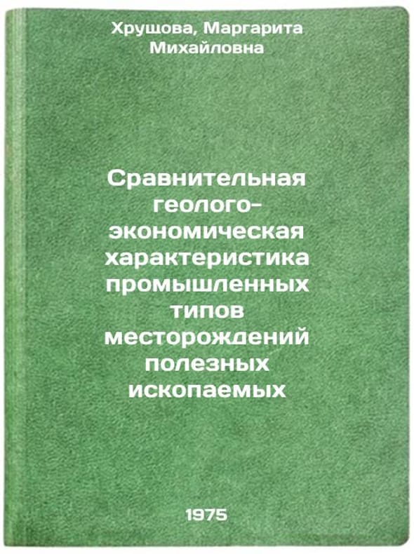 In Russian. Khrushchova, Margarita Mikhailovna. Comparative geological and economic characteristics of industrial types of mineral deposits. Moscow: VIEMS, 1975. Sravnitel'naya geologo-ekonomicheskaya kharakteristika promyshlennykh tipov mestorozhdeniy poleznykh iskopaemykh. In Russian /Comparative geological and economic characteristics of industrial types of mineral deposits. All images are for identification of editions only. Several books of the same edition may be available. Please feel free to request photos of available books. SKU6971008