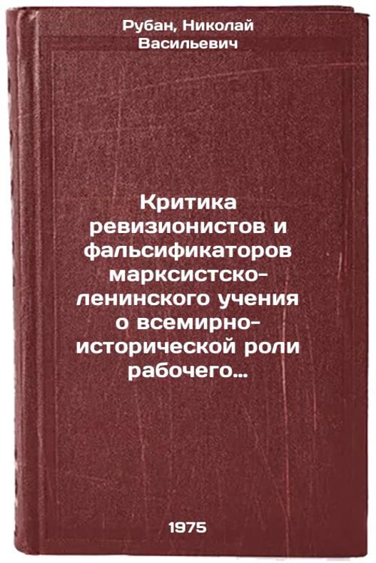 In Russian. Ruban, Nikolai Vasilievich. Criticism of revisionists and falsifiers of Marxist-Leninist teachings on the world-historical role of the working class and its party. Moscow: ZVSh, 1975. Kritika revizionistov i fal'sifikatorov marksistsko-leninskogo ucheniya o vsemirno-istoricheskoy roli rabochego klassa i ego partii. In Russian /Criticism of revisionists and falsifiers of Marxist-Leninist teaching on the world-historical role of the working class and its party. All images are for identification of editions only. Several books of the same edition may be available. Please feel free to request photos of available books. SKU6971337