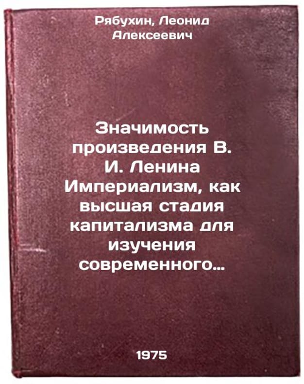 In Russian. Ryabukhin, Leonid Alekseevich. The significance of V. I. Lenin's Imperialism as the Higher Stage of Capitalism for the study of modern capitalism. Saratov: 1975. Znachimost' proizvedeniya V. I. Lenina Imperializm, kak vysshaya stadiya kapitalizma dlya izucheniya sovremennogo kapitalizma. In Russian /The significance of V. I. Lenin's Imperialism as the High Stage of Capitalism for the study of modern capitalism. All images are for identification of editions only. Several books of the same edition may be available. Please feel free to request photos of available books. SKU6971782