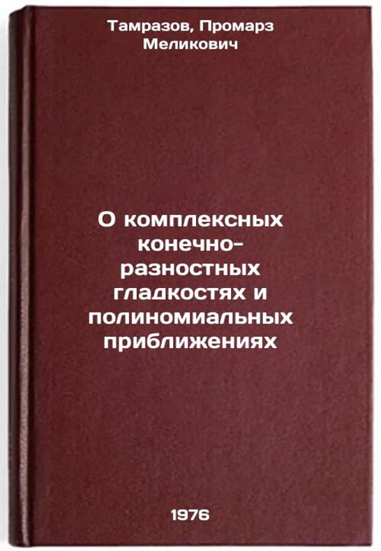In Russian. Tamrazov, Promarz Melikovich. On complex course-difference smoothness and polynomial approximations. Kiev: 1976. O kompleksnykh konechno-raznostnykh gladkostyakh i polinomial'nykh priblizheniyakh. In Russian /On complex course-difference smoothness and polynomial approximations . All images are for identification of editions only. Several books of the same edition may be available. Please feel free to request photos of available books. SKU6973778