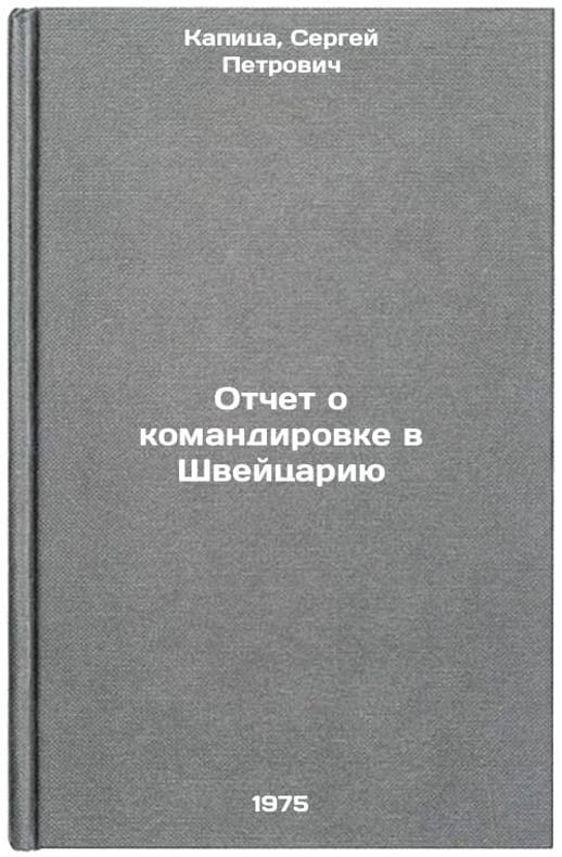 In Russian. Kapitsa, Sergey Petrovich. Report on mission to Switzerland. Moscow: 1975. Otchet o komandirovke v Shveytsariyu. In Russian /Report on a mission to Switzerland. All images are for identification of editions only. Several books of the same edition may be available. Please feel free to request photos of available books. SKU6981919