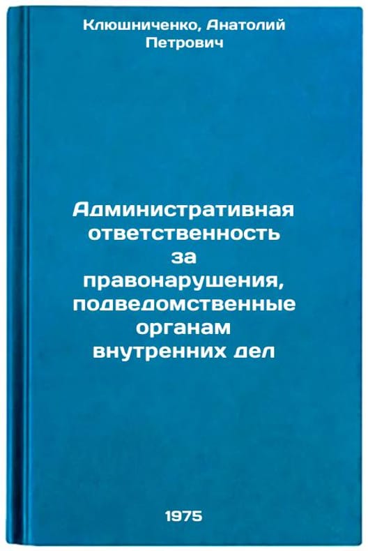 In Russian. Klyushnichenko, Anatoly Petrovich. Administrative Liability for Offences Subordinate to Internal Affairs Bodies. Kyiv: KVS of the Ministry of Internal Affairs of the USSR, 1975. Administrativnaya otvetstvennost' za pravonarusheniya, podvedomstvennye organam vnutrennikh del. In Russian /Administrative Liability for Offences Subordinated to Internal Affairs Bodies. All images are for identification of editions only. Several books of the same edition may be available. Please feel free to request photos of available books. SKU6985311