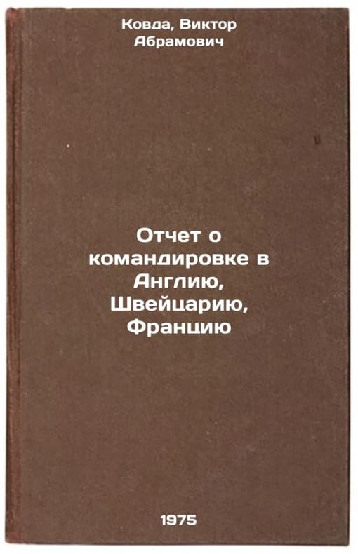 In Russian. Kovda, Viktor Abramovich. Report on his mission to England, Switzerland, France. Moscow: 1975. Otchet o komandirovke v Angliyu, Shveytsariyu, Frantsiyu. In Russian /Report on mission to England, Switzerland, France. All images are for identification of editions only. Several books of the same edition may be available. Please feel free to request photos of available books. SKU6985952