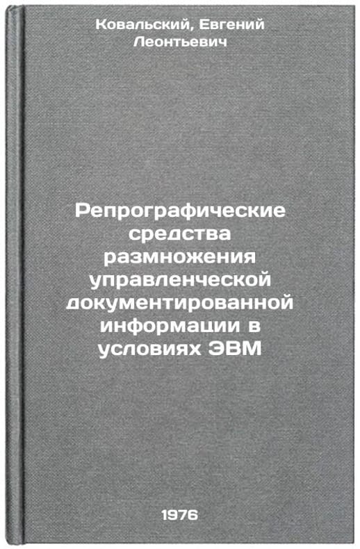 In Russian. Kovalsky, Evgeniy Leontyevich. Reprographic means of reproduction of managerial documented information under computer conditions. Leningrad: 1976. Reprograficheskie sredstva razmnozheniya upravlencheskoy dokumentirovannoy informatsii v usloviyakh EVM. In Russian /Reprographic means of reproduction of management documentary information in a computer environment . All images are for identification of editions only. Several books of the same edition may be available. Please feel free to request photos of available books. SKU6988777