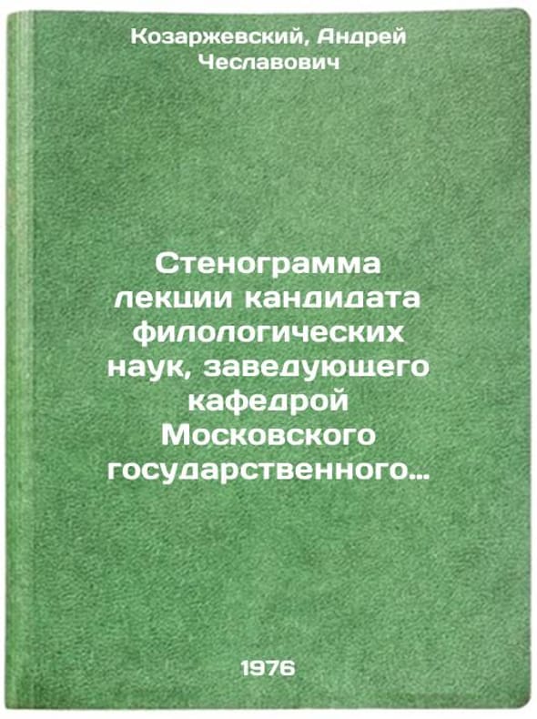 In Russian. Kozarzhevsky, Andrey Cheslavovich. Verbatim transcript of a lecture by A. C. Kozarzhevsky, Candidate of Philology, Head of the Department of Moscow State University, on the topic: The Art of Polemics in Oral Propaganda. Moscow: 1976. Stenogramma lektsii kandidata filologicheskikh nauk, zaveduyushchego kafedroy Moskovskogo gosudarstvennogo Universiteta A. Ch. Kozarzhevskogo na temu: Iskusstvo polemiki v ustnoy propagande. In Russian /Verbatim transcript of a lecture by A. C. Kozarzhevsky, Candidate of Philology, Head of the Department of Moscow State University, on the topic: The Art of Polemics in Oral Propaganda . All images are for identification of editions only. Several books of the same edition may be available. Please feel free to request photos of available books. SKU6988943