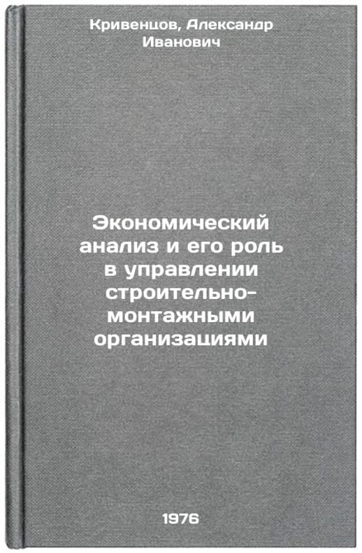 In Russian. Kriventsov, Alexander Ivanovich. Economic analysis and its role in the management of construction and installation organizations. Moscow: Stroyizdat, 1976. Ekonomicheskiy analiz i ego rol' v upravlenii stroitel'no-montazhnymi organizatsiyami. In Russian /Economic analysis and its role in the management of construction and installation organizations . All images are for identification of editions only. Several books of the same edition may be available. Please feel free to request photos of available books. SKU6990744