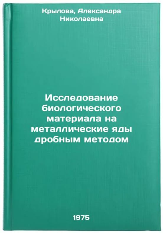 In Russian. Krylova, Alexandra Nikolaevna. Investigation of biological material for metal poisons by fractional method. Moscow: Medicine, 1975. Issledovanie biologicheskogo materiala na metallicheskie yady drobnym metodom. In Russian /Investigation of biological material for metal poisons by fractional method. All images are for identification of editions only. Several books of the same edition may be available. Please feel free to request photos of available books. SKU6991167