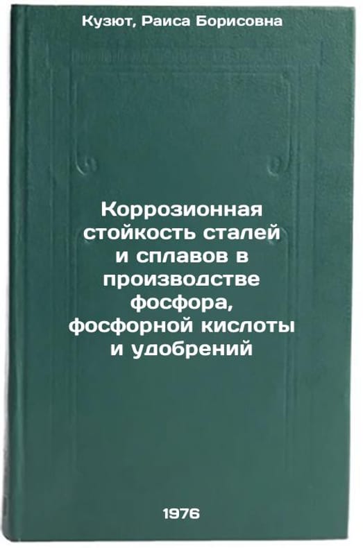 In Russian. Kuzyut, Raisa Borisovna. Corrosion resistance of steels and alloys in the production of phosphorus, phosphoric acid, and fertilizers. Moscow: 1976. Korrozionnaya stoykost' staley i splavov v proizvodstve fosfora, fosfornoy kisloty i udobreniy. In Russian /Corrosion resistance of steels and alloys in the production of phosphorous, phosphoric acid, and fertilizers . All images are for identification of editions only. Several books of the same edition may be available. Please feel free to request photos of available books. SKU6991875