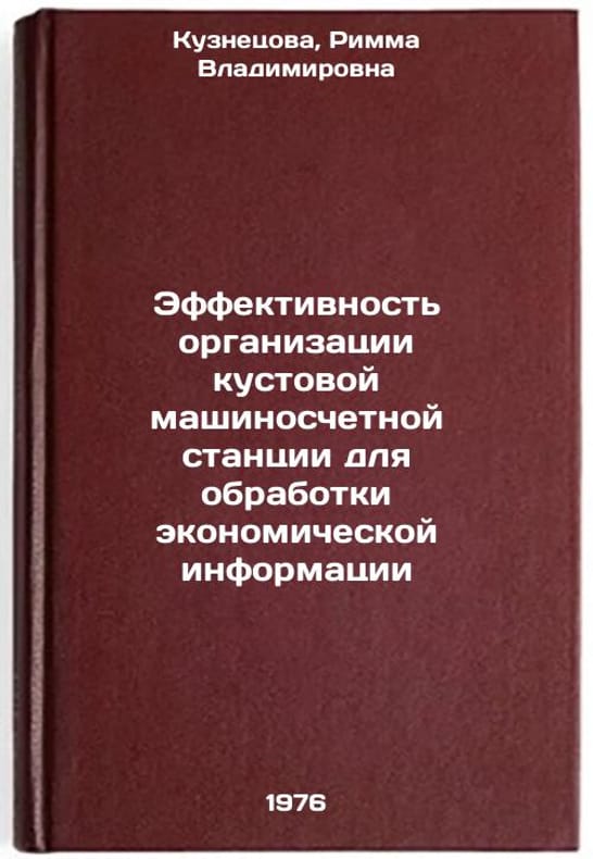 In Russian. Kuznetsova, Rimma Vladimirovna. Efficiency of organizing a cluster machine-counting station for processing economic information. Moscow: 1976. Effektivnost' organizatsii kustovoy mashinoschetnoy stantsii dlya obrabotki ekonomicheskoy informatsii. In Russian /Efficiency of organizing a cluster machine for processing economic information . All images are for identification of editions only. Several books of the same edition may be available. Please feel free to request photos of available books. SKU6992367