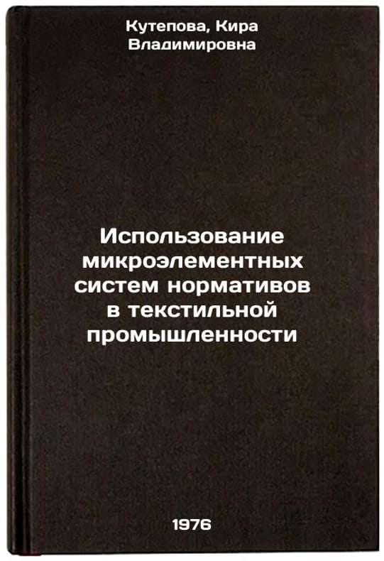 In Russian. Kutepova, Kira Vladimirovna. Use of micro-element regulatory systems in the textile industry. Moscow: 1976. Ispol'zovanie mikroelementnykh sistem normativov v tekstil'noy promyshlennosti. In Russian /Use of micro-element regulatory systems in the textile industry . All images are for identification of editions only. Several books of the same edition may be available. Please feel free to request photos of available books. SKU6993498