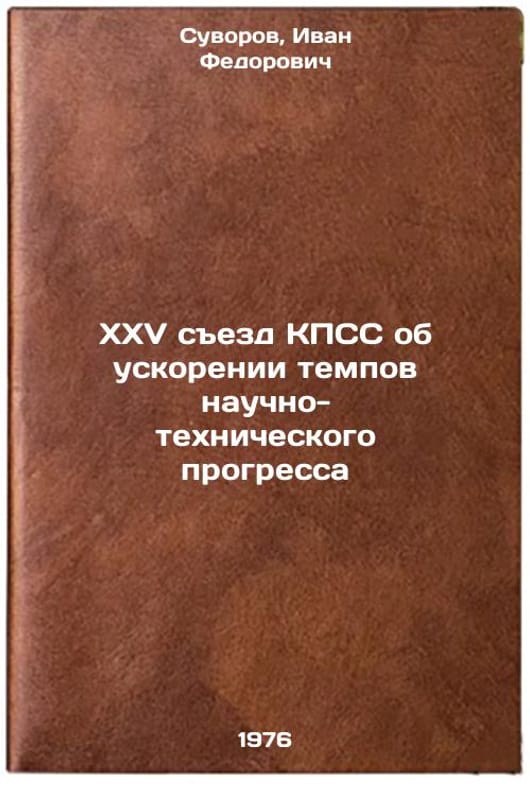 In Russian. Suvorov, Ivan Fedorovich. XXV Congress of the CPSU on accelerating the pace of scientific and technological progress. Ivanovo: 1976. XXV sezd KPSS ob uskorenii tempov nauchno-tekhnicheskogo progressa. In Russian /XXV Congress of the CPSU on accelerating the pace of scientific and technological progress . All images are for identification of editions only. Several books of the same edition may be available. Please feel free to request photos of available books. SKU6995032