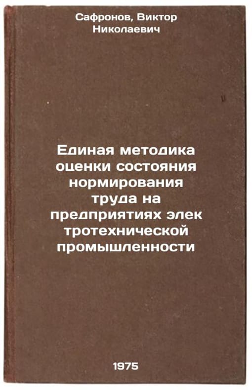 In Russian. Safronov, Viktor Nikolaevich. Unified Methodology for Estimating the State of Labor Rationing at Enterprises of the Electrical Industry. Moscow: Informelectro, 1975. Edinaya metodika otsenki sostoyaniya normirovaniya truda na predpriyatiyakh elektrotekhnicheskoy promyshlennosti. In Russian /Unified Methodology for Assessing the Status of Labour Rationing in the Electrical Industry. All images are for identification of editions only. Several books of the same edition may be available. Please feel free to request photos of available books. SKU6997234