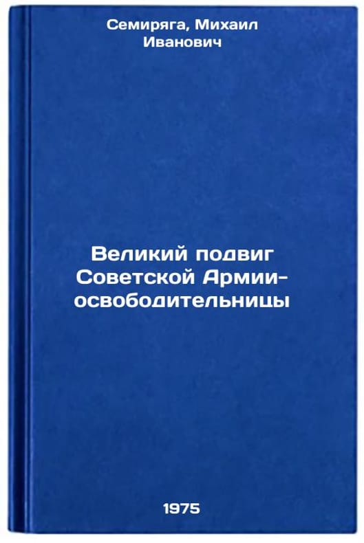 In Russian. Semiryaga, Mikhail Ivanovich. The Great feat of the Soviet Liberation Army. Moscow: DOSAAF Publishing House, 1975. Velikiy podvig Sovetskoy Armii-osvoboditel'nitsy. In Russian /The Great feat of the Soviet Liberation Army. All images are for identification of editions only. Several books of the same edition may be available. Please feel free to request photos of available books. SKU6997944