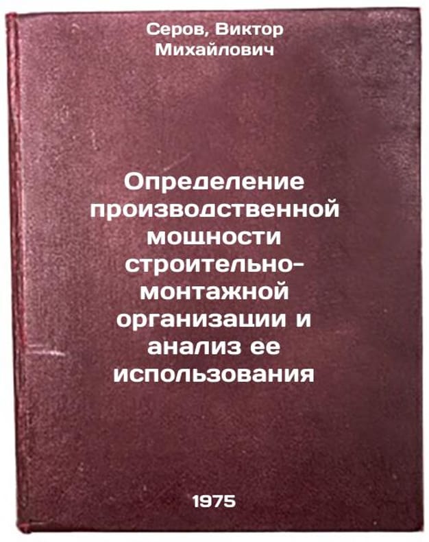 In Russian. Serov, Viktor Mikhailovich. Determination of the production capacity of a construction and installation organization and analysis of its use. Moscow: 1975. Opredelenie proizvodstvennoy moshchnosti stroitel'no-montazhnoy organizatsii i analiz ee ispol'zovaniya. In Russian /Determining the production capacity of a construction and installation organization and analyzing its use. All images are for identification of editions only. Several books of the same edition may be available. Please feel free to request photos of available books. SKU6998376