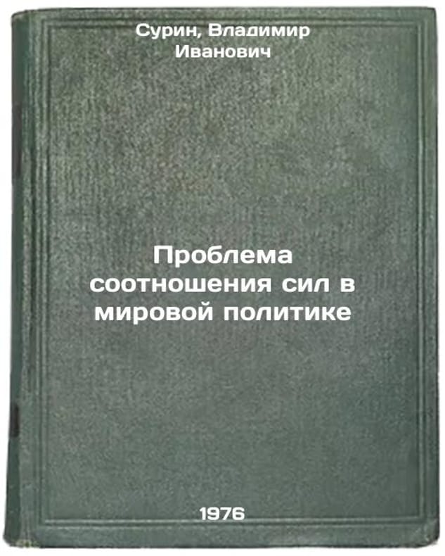 In Russian. Surin, Vladimir Ivanovich. The problem of power relations in world politics. Leningrad: 1976. Problema sootnosheniya sil v mirovoy politike. In Russian /The Power Problem in World Politics . All images are for identification of editions only. Several books of the same edition may be available. Please feel free to request photos of available books. SKU7004408