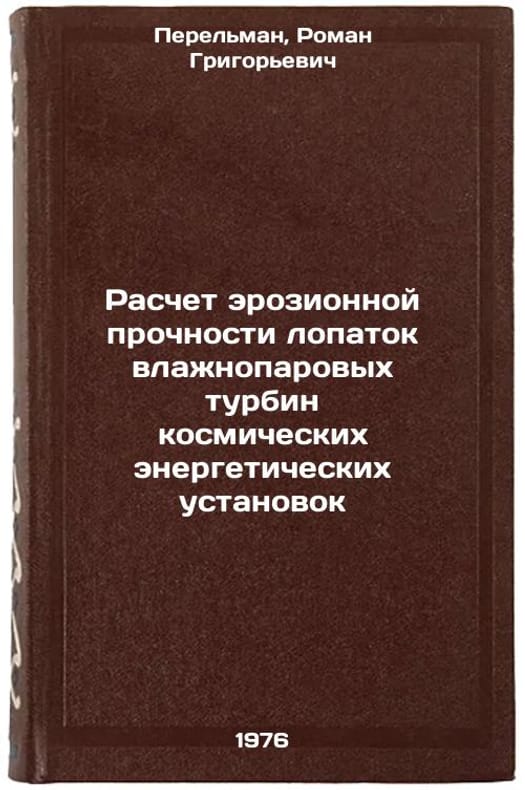 In Russian. Perelman, Roman Grigorievich. Calculation of erosion strength of blades of wet steam turbines of space power plants. Moscow: 1976. Raschet erozionnoy prochnosti lopatok vlazhnoparovykh turbin kosmicheskikh energeticheskikh ustanovok. In Russian /Calculation of erosion strength of blades of wet steam turbines in space power plants . All images are for identification of editions only. Several books of the same edition may be available. Please feel free to request photos of available books. SKU7008670