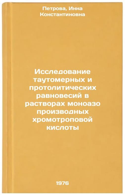 In Russian. Petrova, Inna Konstantinovna. Investigation of tatomer and protolytic equilibrium in solutions of monoazoazoderivative chromotropic acid. Saratov: Publishing House of Saratov, 1976. Issledovanie tautomernykh i protoliticheskikh ravnovesiy v rastvorakh monoazoproizvodnykh khromotropovoy kisloty. In Russian /Investigation of tatomer and protolytic equilibrium in solutions of monoazo-derived chromotropic acid . All images are for identification of editions only. Several books of the same edition may be available. Please feel free to request photos of available books. SKU7009289