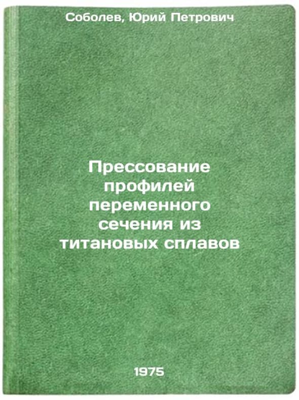 In Russian. Sobolev, Yuri Petrovich. The pressing of the profiles of the alternating section from titanium alloys. Moscow: Tsvetmetinformatsiya, 1975. Pressovanie profiley peremennogo secheniya iz titanovykh splavov. In Russian /The pressing of titanium alloy AC profiles. All images are for identification of editions only. Several books of the same edition may be available. Please feel free to request photos of available books. SKU7009990
