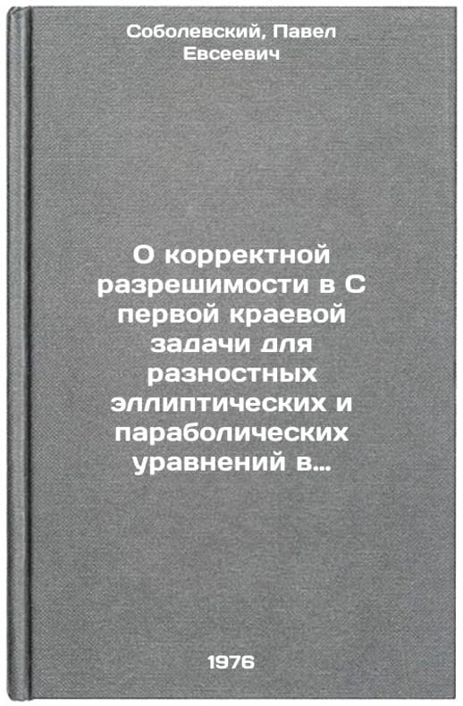 In Russian. Sobolevsky, Pavel Evseevich. On correct solubility in C of the first boundary problem for differential elliptical and parabolic equations in rectangular areas. Novosibirsk: 1976. O korrektnoy razreshimosti v S pervoy kraevoy zadachi dlya raznostnykh ellipticheskikh i parabolicheskikh uravneniy v pryamougol'nykh oblastyakh. In Russian /On the correct solubility in C of the first boundary problem for differential elliptical and parabolic equations in rectangular areas . All images are for identification of editions only. Several books of the same edition may be available. Please feel free to request photos of available books. SKU7010013
