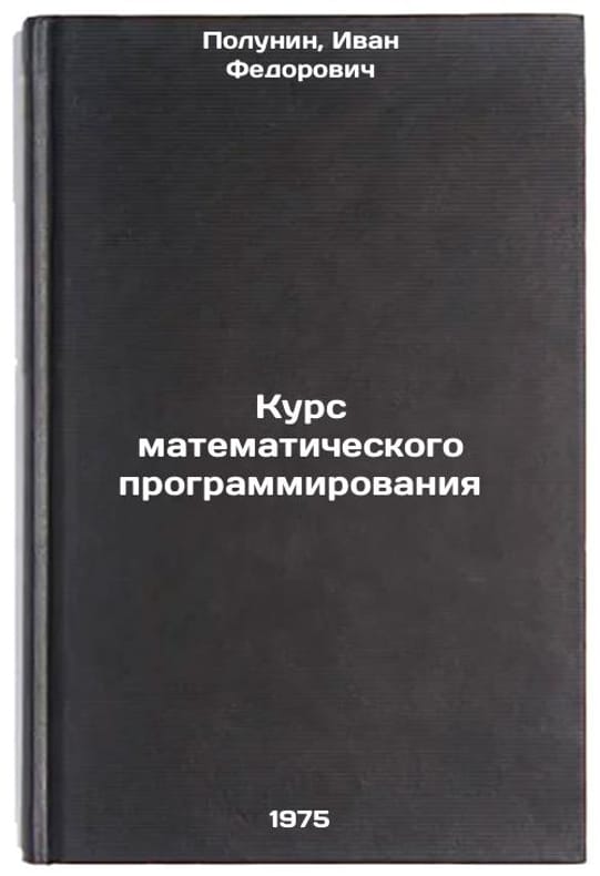 Short description: In Russian. Polunin, Ivan Fedorovich. Mathematical programming course. Minsk: High School, 1970. Kurs matematicheskogo programmirovaniya. In Russian /Mathematical programming course. The image is provided for reference only. It may reflect condition of one of the available copies or only help in identifying the edition. Please feel free to contact us for a detailed description of the copies available. SKU7329041